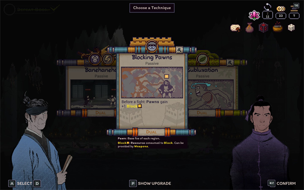 例如,下面图片中的升级表面上看似简单且弱小,但实际上它多次救了我命,因为武器能让你有机会格挡任何来袭攻击。这很有效,因为最后存活的敌人可以获得彻底扭转局势的增益。