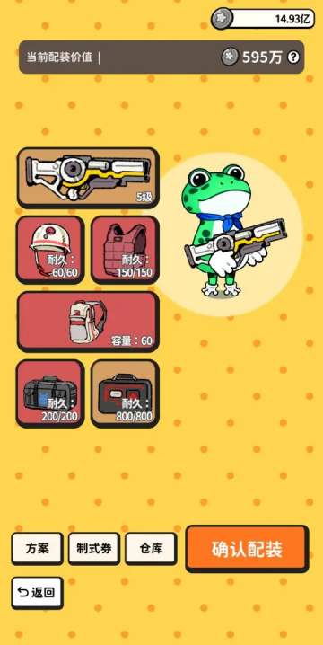 1、进入角色配装界面,为青蛙角色选择合适的武器与装备,包括5级枪械、头盔、防弹衣、背包及容量扩展包,确认当前配装价值后点击【确认配装】。