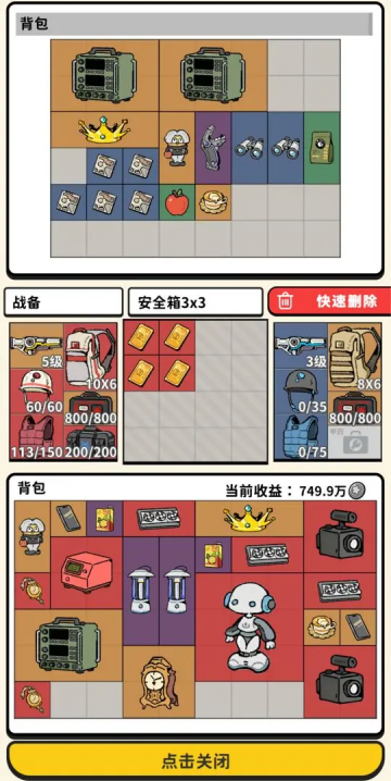 2、打开背包系统,查看并整理已获得的物资,如安全箱、相机、金币、道具等,合理分配至战备区和安全箱中,提升行动效率与收益。