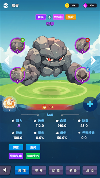 3、升级精英精灵的属性、技能及成长潜力,可进行属性、喂养、技能等多维度培养。