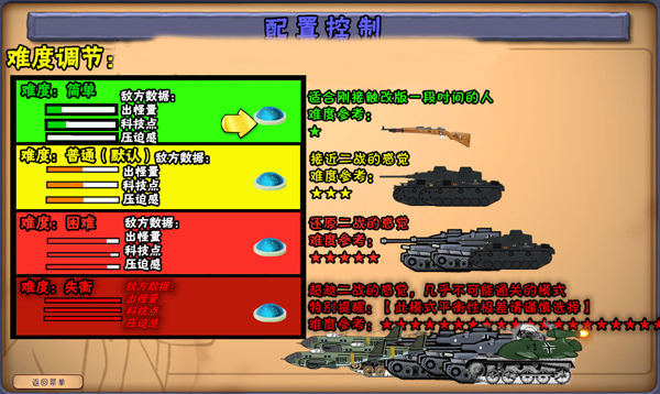 游戏内设有独立的控制与难度配置界面,包含简单、普通(默认)、困难、失衡四种难度等级。难度越高,敌军单位的生命值、攻击力与进攻强度越强,其中失衡模式数值极端,几乎无法正常通关,更偏向挑战与测试用途。