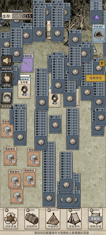 生存者可以从诡矿中采集诡币,用于下方野外区域的资源随机获取,前期推荐将诡矿升级到中级进行采集,每个级别的野外区域会获得对应级别的祭坛,祭坛收容诡异概率为100%。
