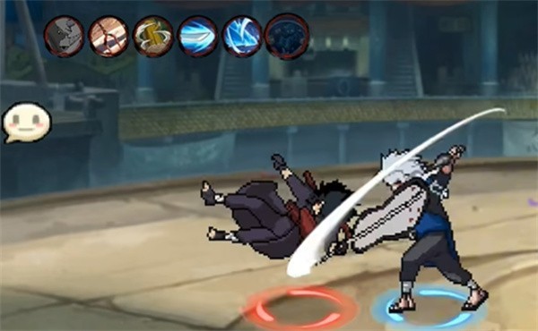 6、通过虚拟按钮控制角色在场景中移动,上下左右都行,在对战的时候可以使用右边的忍术,不过每个忍术都有冷却时间,使用的时候需要留意时机。