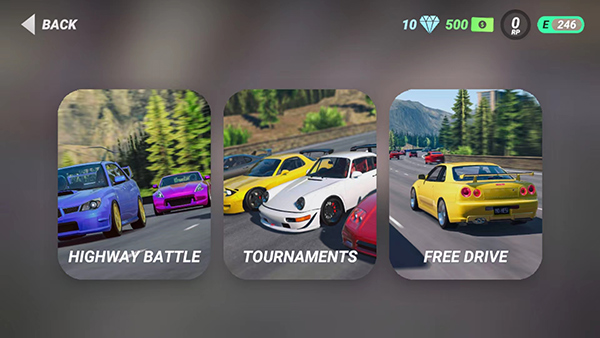 5、游戏分为【highway battle】公路战 、【tournaments】锦标赛和【freedrive】自由驾驶三种游戏模式,玩家可自行选择体验,这里以公路战为例
