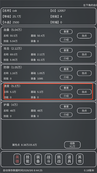 3、通过打怪掉落的属性点可以对英雄属性升级,其中要注意速度属性,它决定你的打怪速率,当能一级秒杀怪物时,选择升级速度是最优选择。