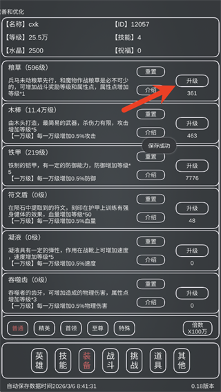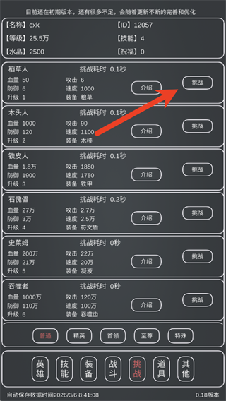 1、游戏玩法主要围绕打怪升级属性,比如开局的稻草人,每次击败成功就会获得一个升级道具,通过装备界面升级。