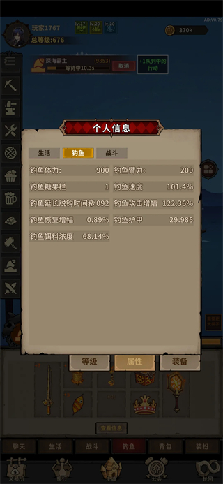 接下来是钓鱼,钓鱼只需要带好相应的装备和饵料就可以挂机了,基本和三采类似,但是有更多的惊喜,并且收益也很可观,可以开局直接玩。