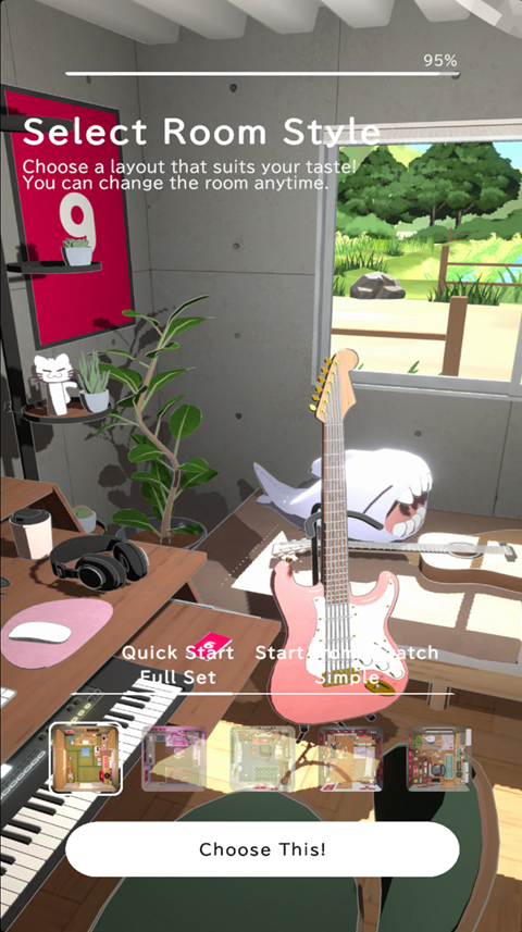 3、接下来,从五种不同风格的房间中挑选一个喜欢的场景,正式进入游戏后,你会看到角色正静坐在桌前。