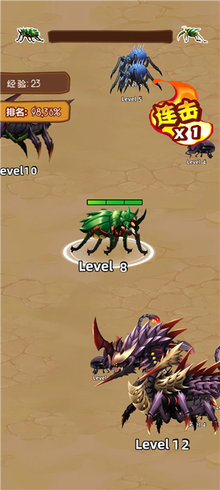 昆虫超进化是一款策略养成休闲手游,游戏中玩家们将要操纵一只昆虫在固定的地图中进行战斗,面对比自己小的生物要进行吞噬,面对比自己大的生物要躲避起来,这类玩法有些许类似于“大鱼吃小鱼”。开局你只是一只小小的蚂蚁,期间你可以通过吞噬来逐渐的壮大自己,让自己获得进化,成为蝎子、蜘蛛、甲壳虫、螳螂等等,其中每一种种类的昆虫都有着不同的属性和玩法,进而再吞噬更是高级的生物,在这里我们需要运用策略来决定何时吞噬哪些昆虫以获得足够的能量进行升级,同时要躲避比自己强大的敌人,合理规划成长路线!