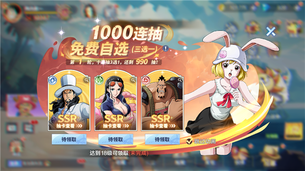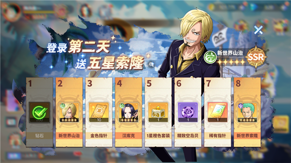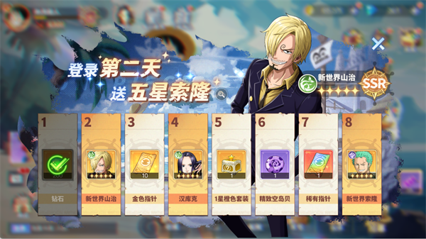 每日登录游戏即可领取丰厚奖励,包括钻石、SSR新世界山治、汉库克、五星新世界索隆等强力角色。累计登录还可获得更多奖励,助力你的成长之路。