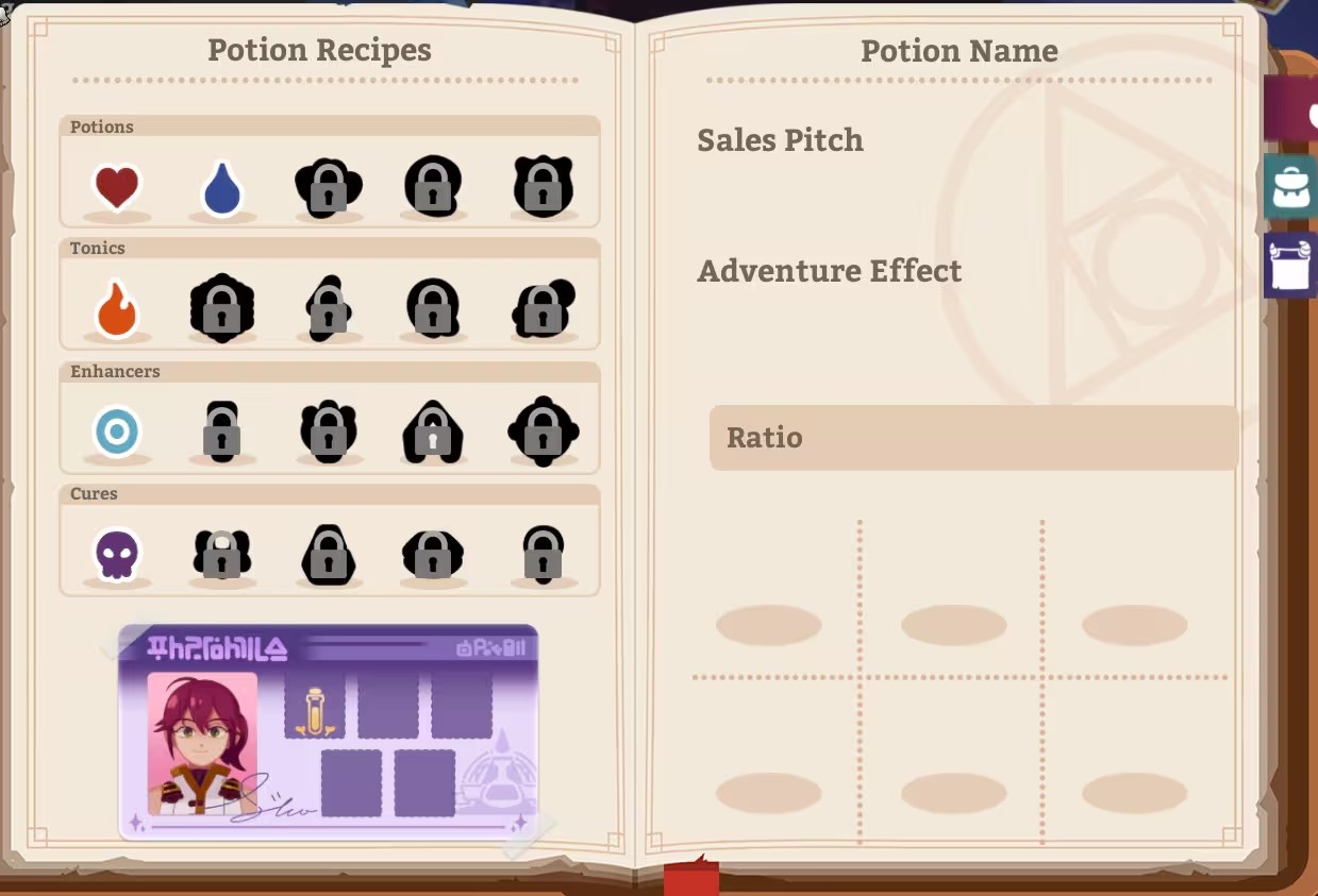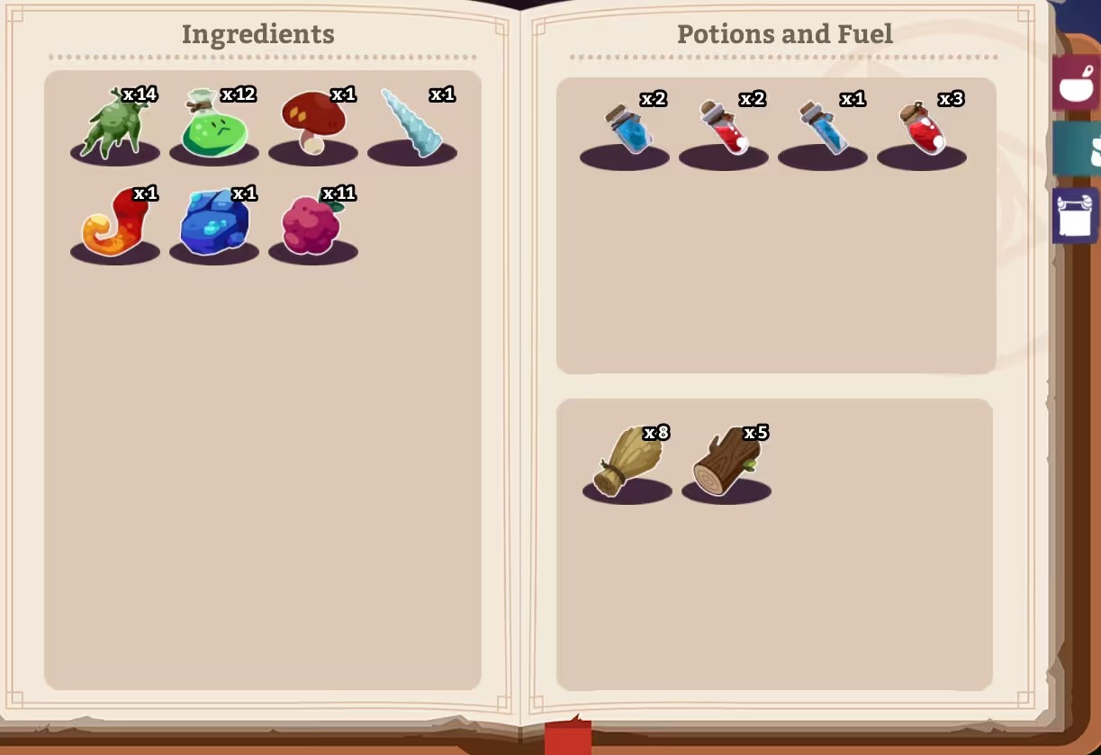 4、右上角的书籍可以打开,查看你当前会的药水配方和物品栏。