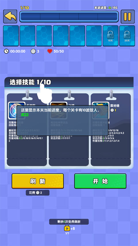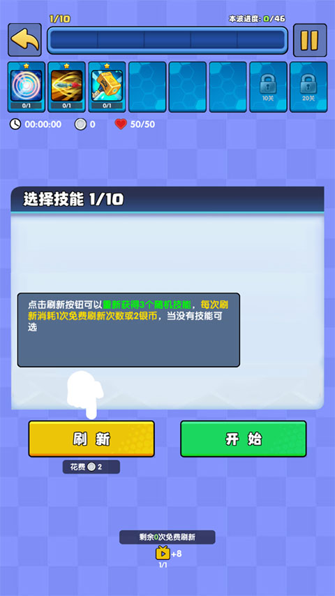 每通关1波敌人后,会进入新一轮技能选择界面。