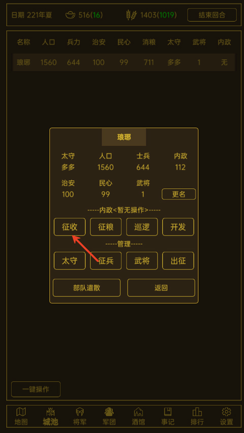 5、还可以对你驻守的城池征收、征粮、征兵等。