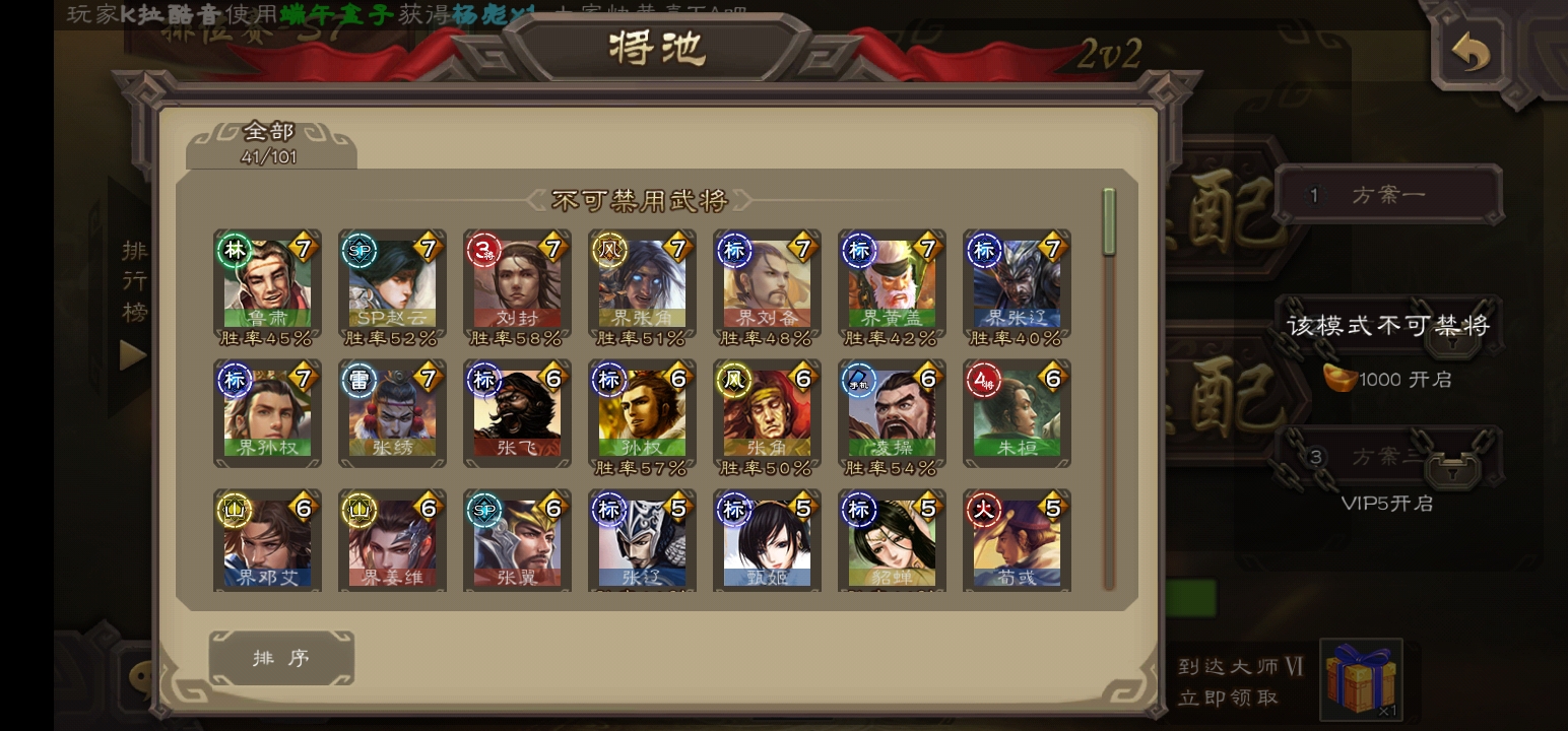 全民锦标赛采用的也是2v2玩法,重要参与。可以体验到很多萌新玩家或者非氪金玩家很难体验到的武将。