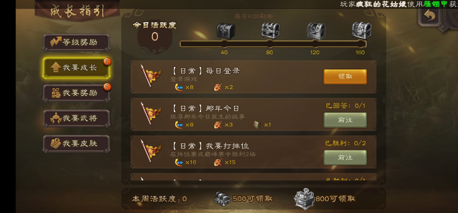 武将试炼每天会更新不同的三个关卡,就是选择指定武将然后获得胜利即可。通关后可以在任务页面领取300经验,