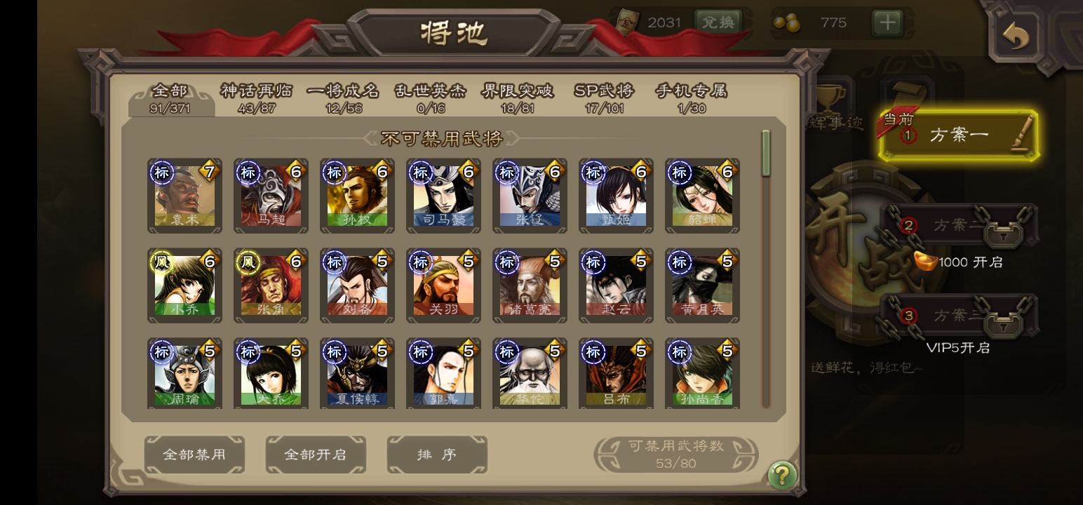 进入之后是这么一个页面,这个页面不止能查看将池以及你能够使用的武将,还涉及一个模式禁将的设定。不过排位赛不能禁将。