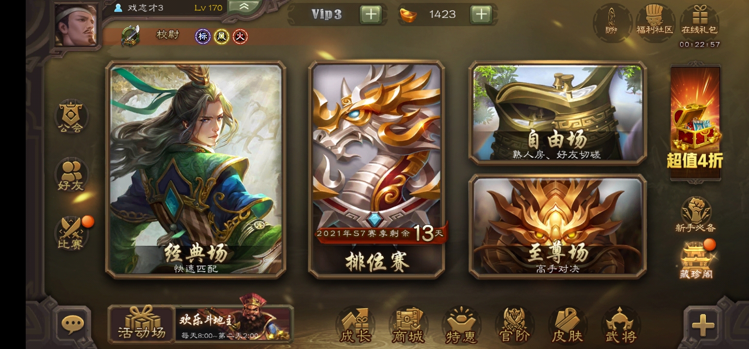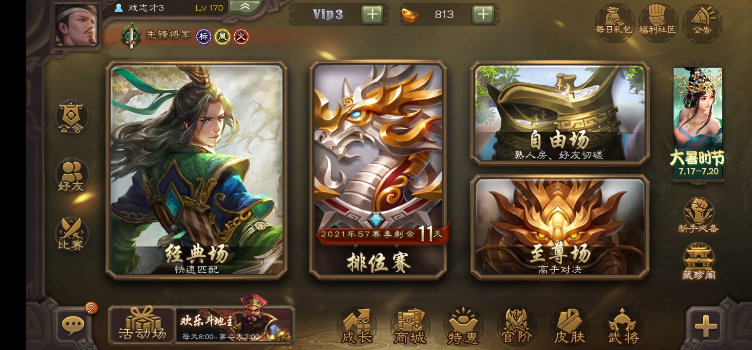 而三国杀为了保持游戏活跃人数,基本一年365天330天都在搞活动。各种各样的活动。每逢24节气或者传统节日或者国际节日基本都是活动。每天上线看看准没错。