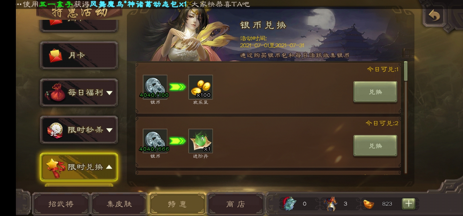 我比较推荐的就是限时兑换里面这个100银币换100欢乐豆。