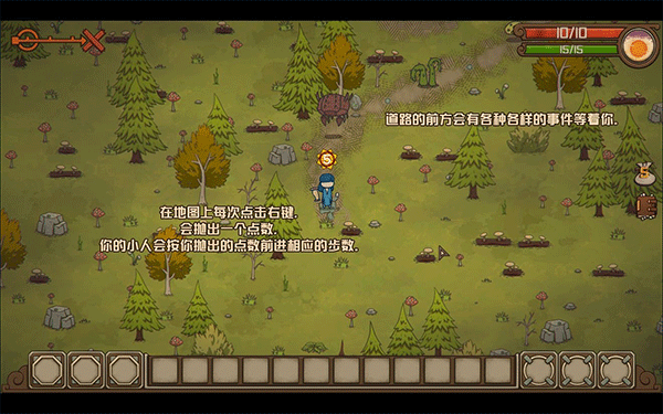 每次前进以及遭遇某些事件时会消耗体力,当体力为0时会发生一些负面事件,所以记得喂饱自己吧。