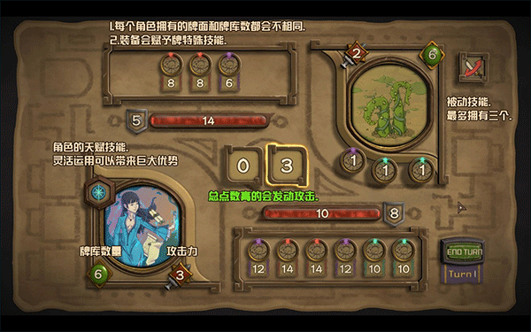 而通过计算双方的手牌以及牌库内容,通过合理使用不同技能资源最后获得胜利,则是需要玩家需要思考的内容。注意,并不是一直攻击才是唯一的获胜手段,游戏中有许多可以让敌人自取灭亡的手段。(反击伤害,疲劳伤害等等)。