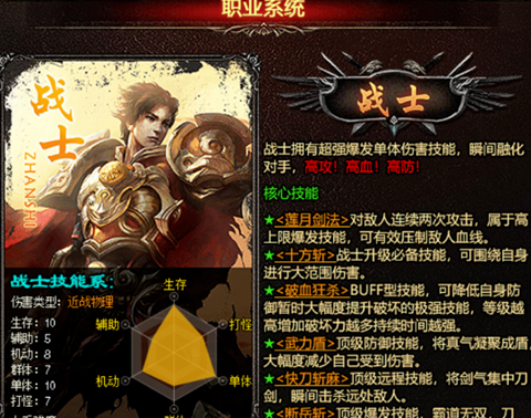 战士在前期成型慢,在装备,级别同等级下,没有任何优势。后期投入很大,纯消耗,需要RMB玩家。成型之后,莽就完事了。其他职业一旦被战士近战就是战士的carry时间,等待着将是血量瞬间清空。PVP玩家首选。