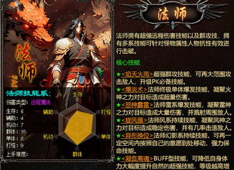 法师作为一个AOE职业,脆皮但攻击高,前期发育快,打副本可以打群怪,拥有群攻技能,投入比较少。喜欢在刀尖上起舞的玩家首选,喜欢打爆炸输出,喜欢在后排快乐,只要不死,敌人就是风筝。