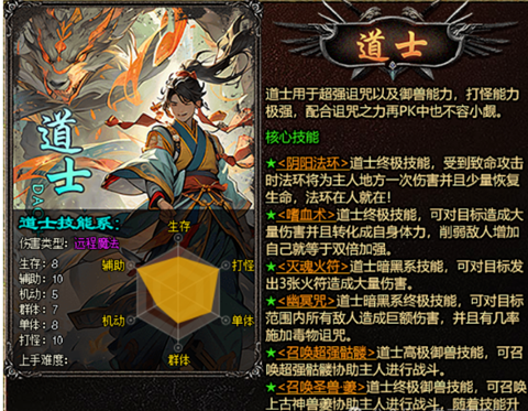 道士在游戏中就是个大奶,有输出,拥有自己的前排坦克。打怪战宠牵制,后排输出。血少时,一个治疗瞬间满血。不需耗费其他资源,想要免费,就选道士,平时打打装备,很佛系的职业,打副本,打团就做个辅助工具人。打金玩家首选!