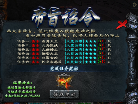 除了主线与剧情外,还有大荒重器(必做)>妖女克星(必做)>狮蛮传承>巨妖之力,元宝足够的情况下推荐在冒险之都内打怪,而且冒险之都每进入1次可获得一个碎片,集齐一定数量碎片可兑换称号(必换);元宝不太充足的情况下可以在各个地图内的副本图处打怪,例如:狮蛮国近郊下级地图哥布林王国,蛇族领地下级地
