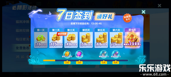 签到机制是微乐捕鱼千炮版游戏的亮点之一,根据连续签到的日子长短,奖励的金币也越来越多,不要小看这几千金币,在历练场里你可以化几千为几万,再用这几万去大奖赛房间里赚取几十万几百万都不在话下。
