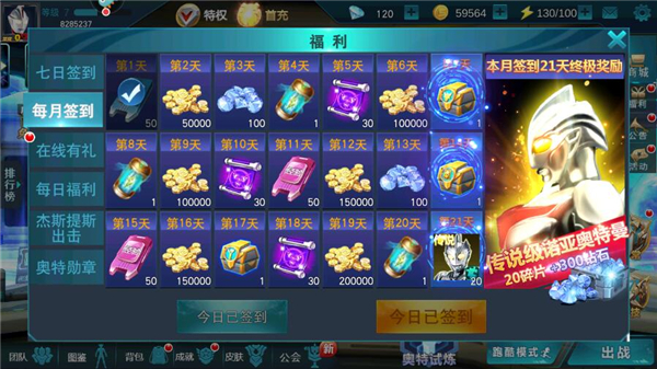 1、新手任务与签到奖励:新人完成七日限时任务可免费赢取德凯奥特曼;游戏等级达到15级即可领取捷德奥特曼;每月累计签到21天,可获得神秘四奥之一的诺亚奥特曼。