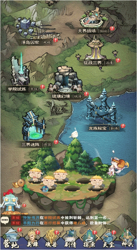 点击“探索”按钮可快速进入各类玩法界面,例如天界战场(BOSS战)、浮岛囚笼(爬塔玩法)、征战三界(派遣玩法)等等,都等着大家自行前往探索。