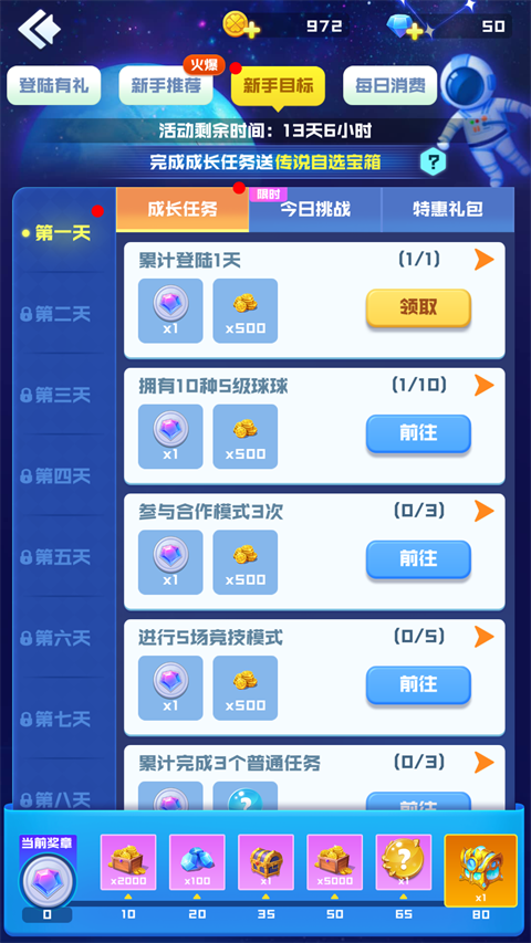 3、新手目标,达成指定任务即可领取免费奖励。