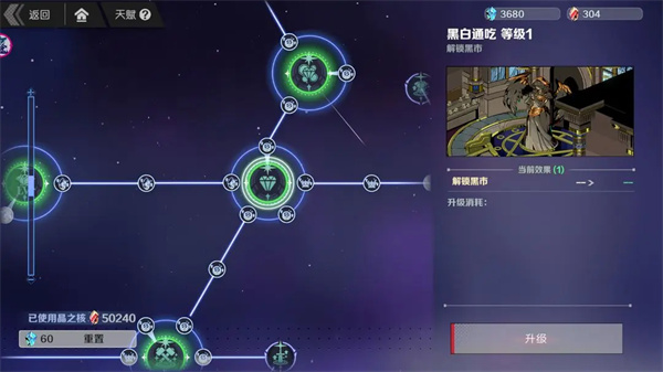 第一天我们还有一件必须完成的就是把我们的黑市天赋点出来,刃境的天赋系统需要一种叫做晶之核的资源来点亮,晶之核主要获取途径在秘境内,需要反复的刷怪获取,我们把黑市天赋点亮之后,通过黑市,每天可以使用蓝钻购买3600个晶之核,可以大大的减少我们的肝度。