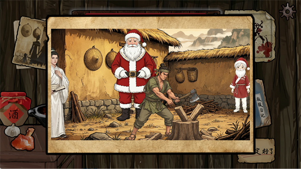 1、玩家将扮演一位樵夫,游戏开始时你位于木屋中,窗外出现了一位戴耳机的火焰头访客。桌上摆放着酒、大蒜等道具,同时界面上显示着“访客耐心条”和一些功能按钮。