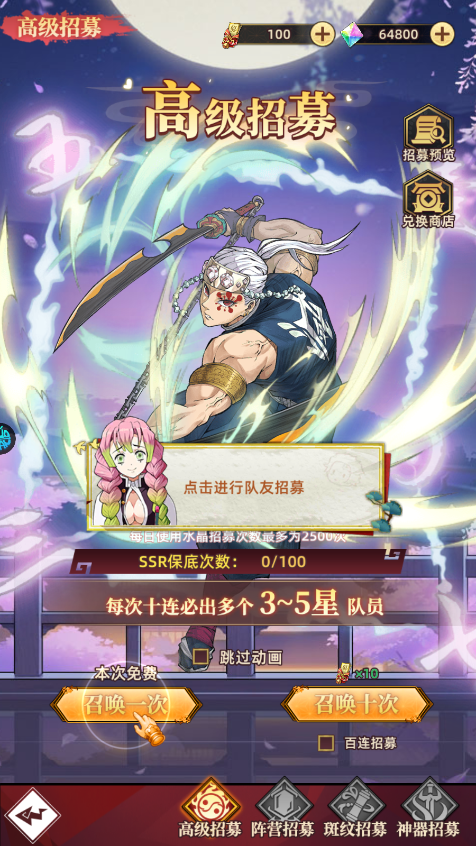 8、保底100抽一个SSR,不过第一抽免费,快下载游戏试试自己的手气吧!