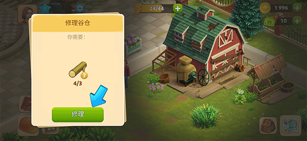 5、农场中的很多设施需要修理后才能用,例如谷仓,修理前需要拥有足够的材料菜可以修复哦。