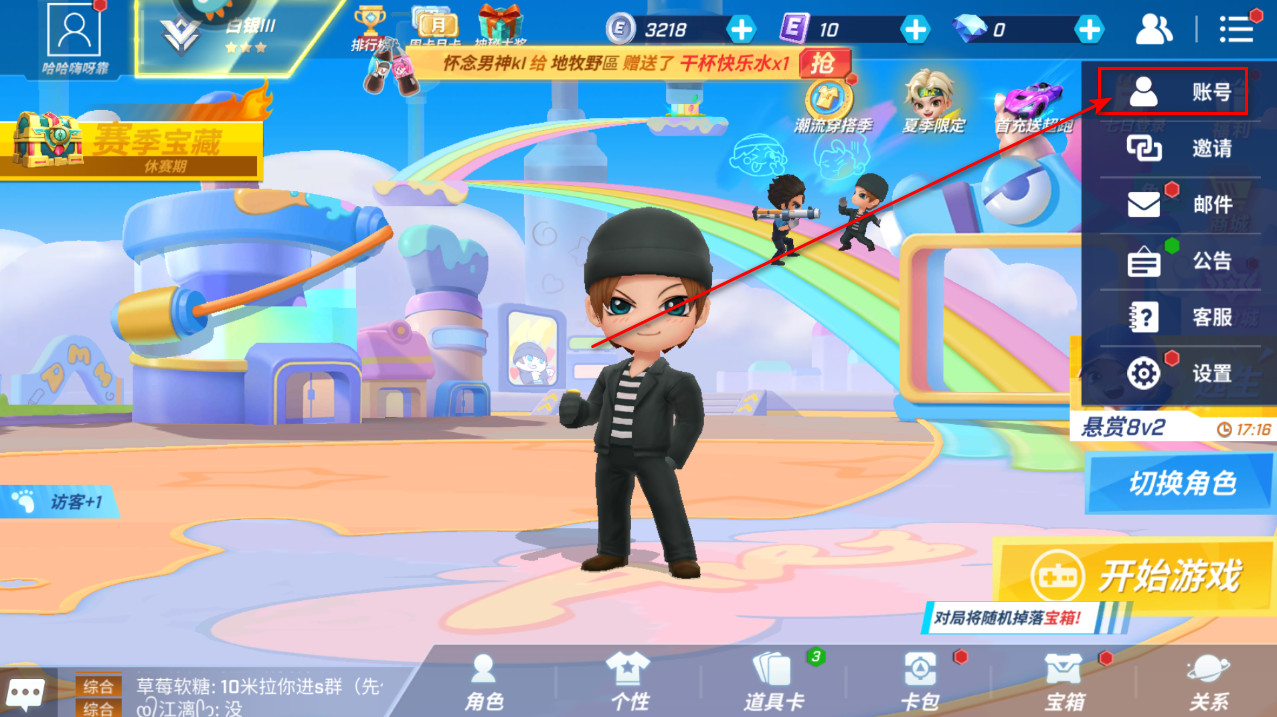 1、道具卡携带:医疗箱(回血,一次救多人,建议锁定)、跳高(逃禁闭室用的,建议放在前面,不然难逃禁闭)、疾跑(速度快,不会因为受攻击打断,最重要的是花费少)、火箭筒(打追捕用的,没事来上一两炮,还有击退效果)、手雷(给对面的迟钝剂,可以造成减速和无法攻击)、皮卡(跑的贼快,逃命时用的,没事还能拉人),以上是新手建议带的卡组,不一定要用,可以自己调整。