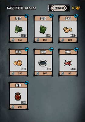 食材每4个小时可购买一次,总计需要花费46500两购得以下食材: