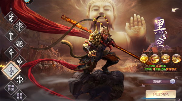 游戏目前开放八大职业,各具特色与定位,130级后开启转职,三转后可自由切换其他职业,新手玩家建议优先选择【黑悟空】,其核心技能【腾云驾雾】具备高效的群体冲刺伤害能力,清怪速度快、容错率高,非常适合前期刷图与快速升级。