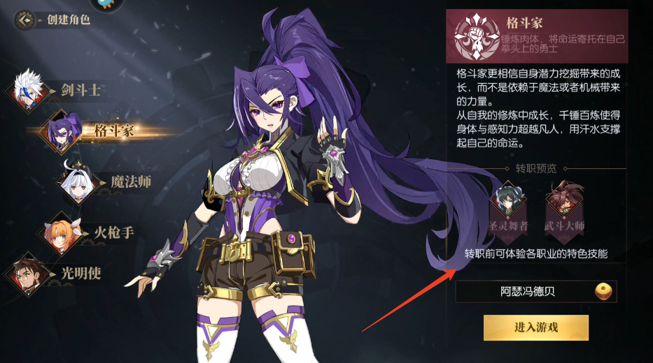 3、比如格斗家就能转职为圣灵舞者或者武斗大师,每个转职的方向不同,比如圣灵舞者有不错的辅助能力,而武斗大师则在爆发方面更加突出。点击左上箭头可以退出预览。