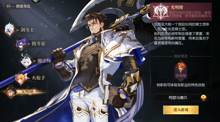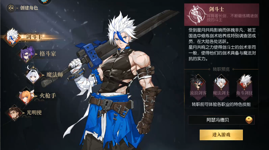 2、然后玩家就会进入职业选择界面,每个都职业都有简单的介绍,以及转职的预览。