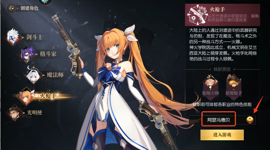 9、可以转职为驱魔枪手和枪炮大师,枪炮大师一看就火力充足。玩家选好职业点击“进入游戏”就可以开始你的全新游戏生涯了!