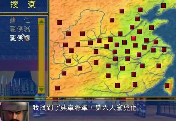 游戏开局很重要,第一次内政如果搜索到好的武将,那将为你扫平天下起到事半功倍的效果,拿讨伐董卓来说,毕竟是绝大多数三国群英传1的玩家第一个接触到的剧本,开局有几个强力武将可以搜索出来,分别为太史慈出现在平原附近,典韦出现在陈留,黄忠在长安附近这三位是开局能搜索出的最强武将,还有许褚出现在谯,徐晃在邺,周泰甘宁在江夏,选择相应的君主如刘备袁绍搜太史慈,曹操搜典韦,董卓搜黄忠,孙坚的话内政结束先进攻江夏等下次内政搜人,其余强力武将如赵云198年出现在宛和新野附近,魏延201年襄阳附近,姜维215年天水,马超198年天水。
