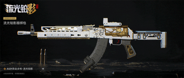 【AKM突击步枪-流光铂影】的设计更是别出心裁,枪管、握把、枪托的镂空处均雕刻成花枝剪影,搭配几何切割边框,规整而精美。