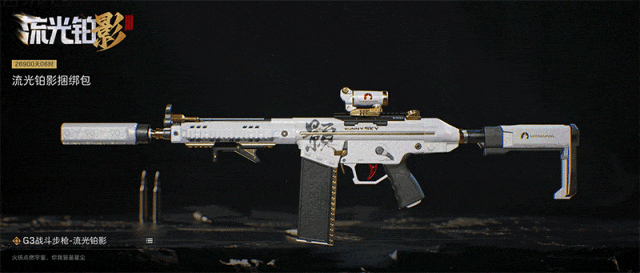 【G3战斗步枪-流光铂影】由铂金和银色金属打造,散发着明亮而冷冽的光泽。