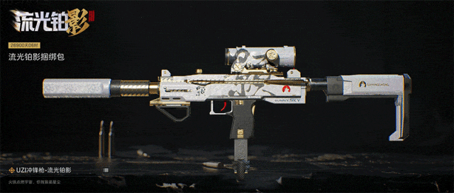 【UZI冲锋枪-流光铂影】由巨大的毛笔字占据视觉中心,字以金线勾边,好似正在被战火灼烧。