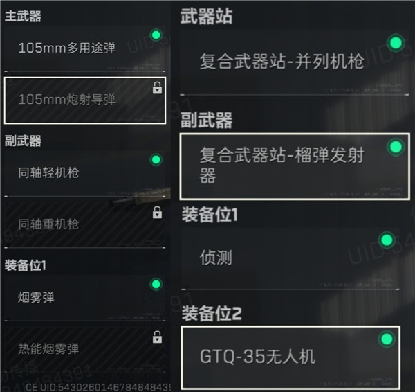 而且这个坦克还上新了很多武器和装置,主武器是105mm的多用途弹和炮射导弹,前者是打人用的且范围大,后者是打车用的可以自动锁载具,武器站新增了并列机枪和榴弹发射器,车长位2技能则是GTQ35无人机,使用后会释放出一个小型无人机,自动攻击周围的目标。