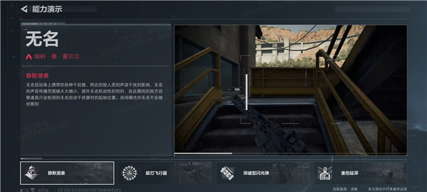 然后再说说无名的四个技能,分别是静默潜袭、旋刃飞行器、突破型闪光弹、重伤延滞,说完了技能名称,再来简单说说他的技能效果。