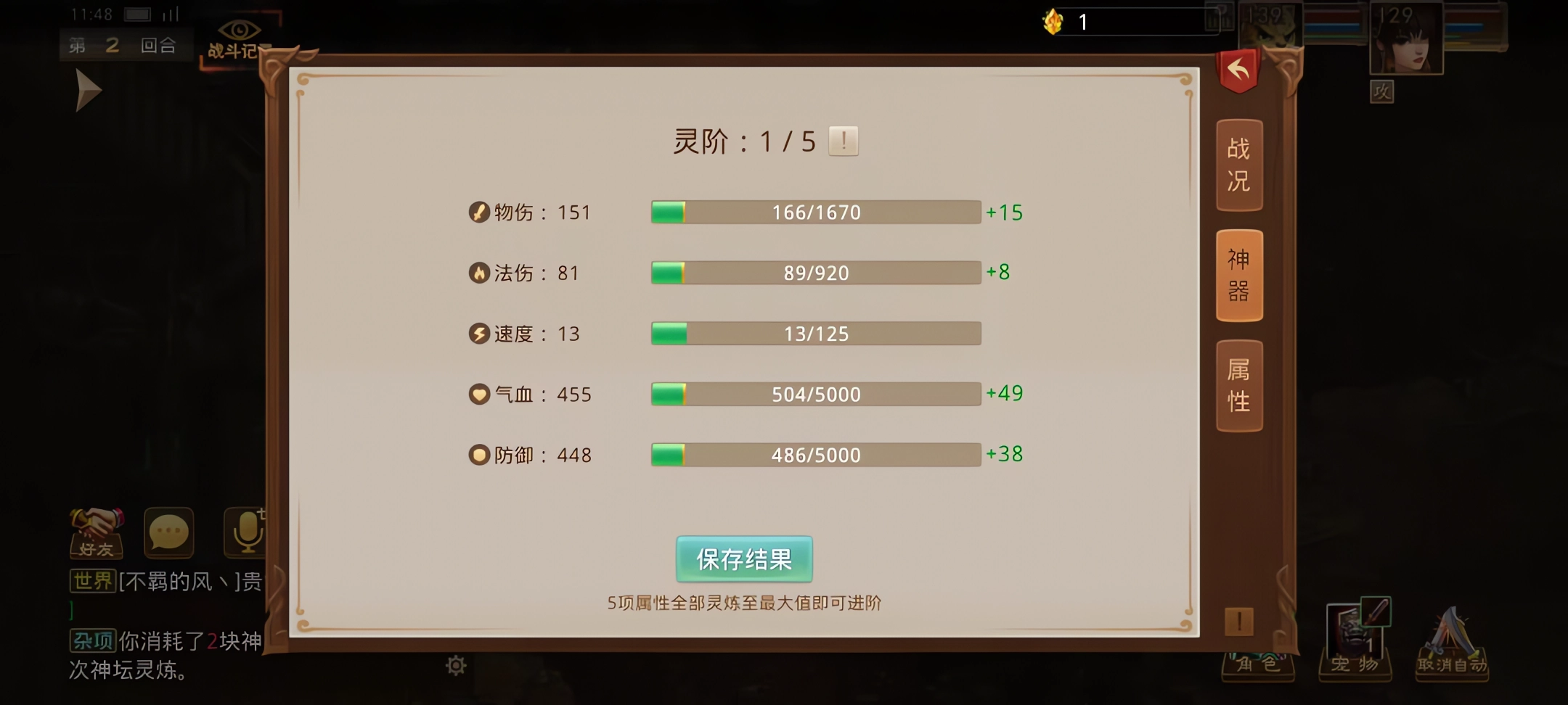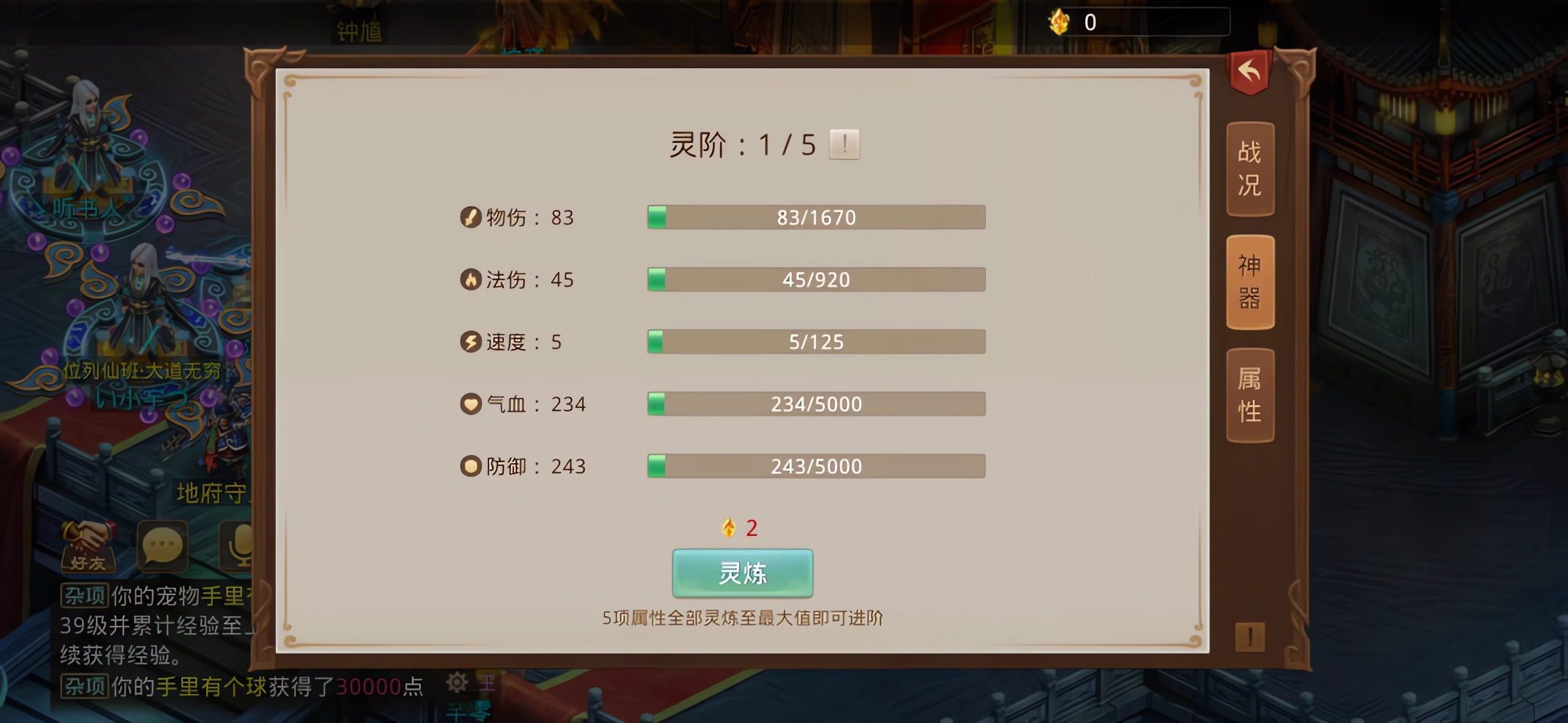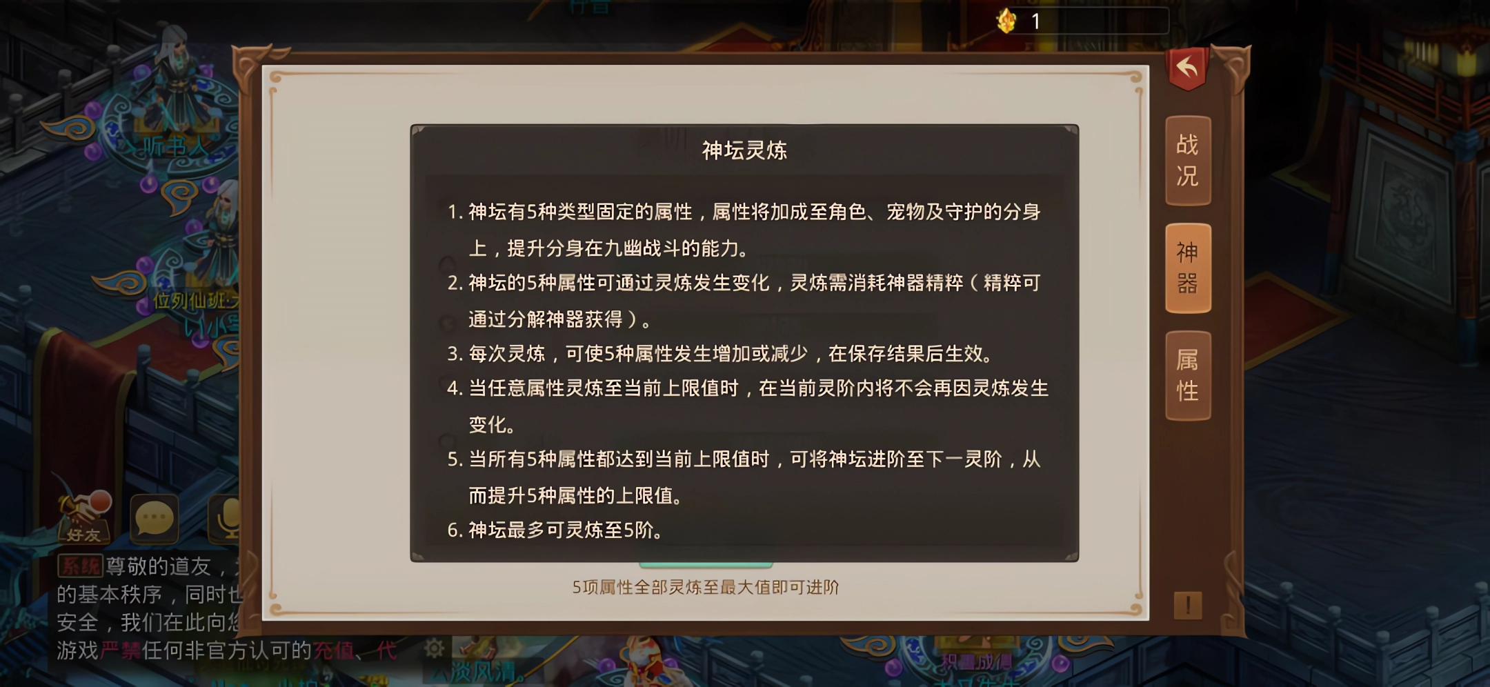 3、神坛灵炼:专属于九幽里面的属性加成系统,上面就有说过,没用的心源神器是可以分解的,分解会产生一定数量的神器精碎,神器精碎可以用来神坛灵炼提升大家在九幽的属性,神坛一共分别5层,每一层有五种提升属性,分别是:物伤、法伤、速度、气血、防御,把5种属性全部培育至上限即可进入下一层。