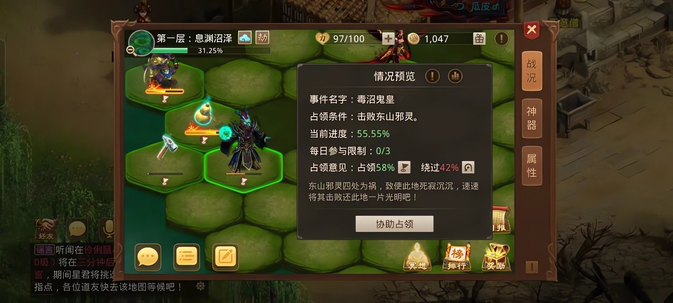 2、每一关,都被分为许许多多的单个区域,每一个区域需要全服玩家完成该区域的事件去占领它(每次参与事件需要消耗心源之力),当占领了本区域之后,附近的两块区域也会被解锁,这样随着解锁/占领的区域越多,我们玩家离本层boss也会越来越近。